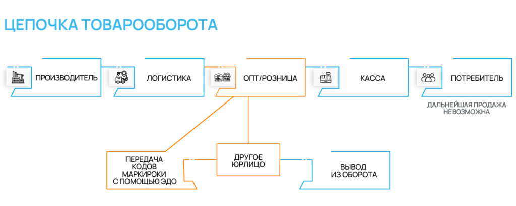 Участники торговой цепочки передают друг другу коды маркировки, и система мониторинга фиксирует каждое движение товара с помощью ЭДО. При продаже конечному потребителю товар выводится из оборота.